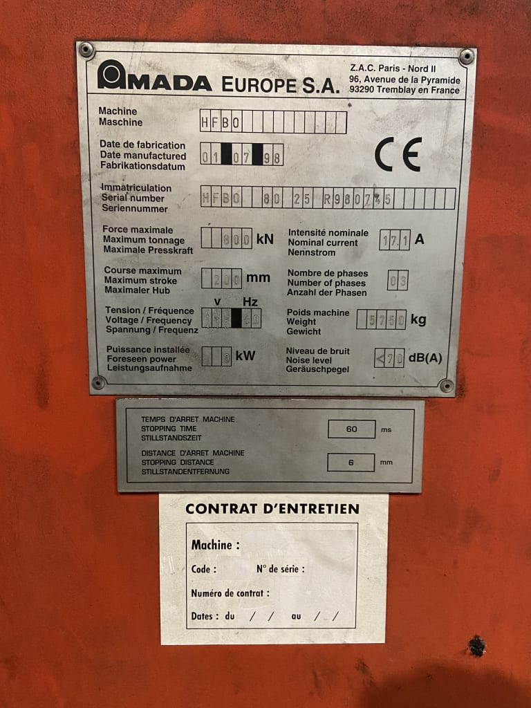 Capacity 80 T - Bending length 2505mm - Distance between uprights 2120mm - Throatdepth 420mm - Weight 4990.9 kg - Vertical travel 200mm - Working speed 10mm/s - Number of backgauge axes 8 - Motor power 7.45 kW - Dimensions 3100x2185x2550mm - Weight approx. 5T - Approx. 13000Kg - Year 1998 - Origin: Japan. NOTE - A loading fee of EUR1000 will be added to the invoice. Location: 59300 Valenciennes, France - LOT 5