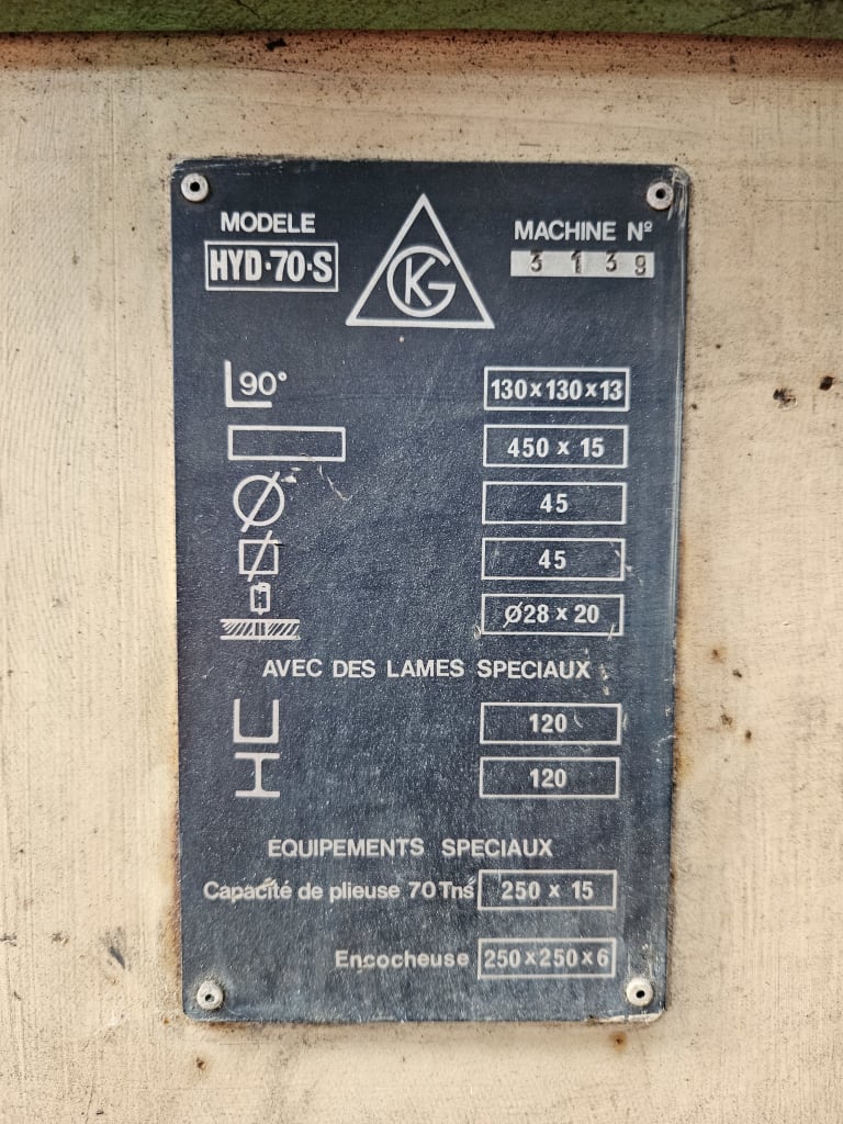 Capacity in L profile 60x60x5mm - capacity in the square bars 40x20 or 50x17mm - power 6 kw - Approx. 3100Kg - Origin : France. Please Note that this lot has loading charges of EUR400. This will be added to your invoice. Location : 59300 Valenciennes, France - LOT 32