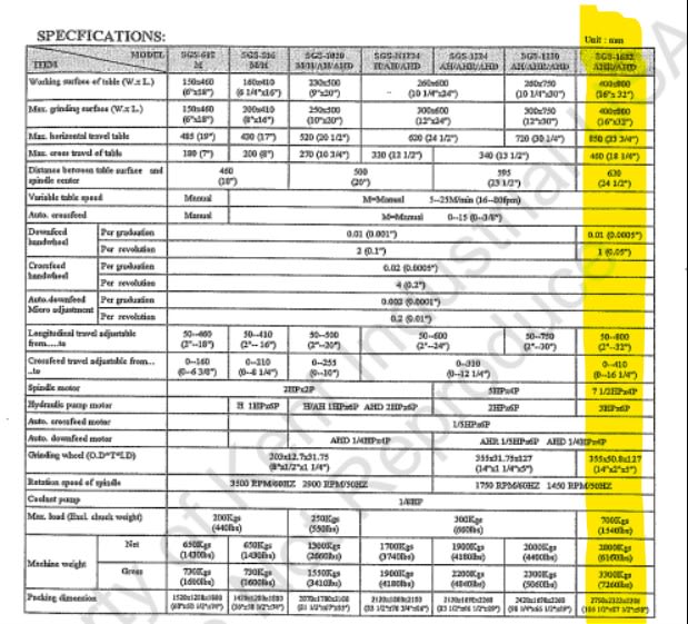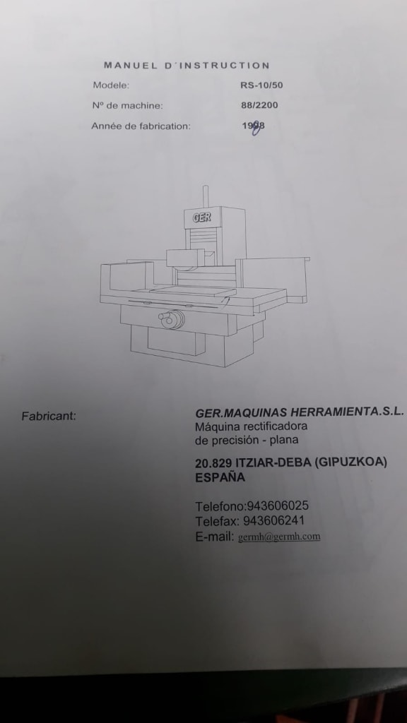 Table: Table length: 200mm - Table width: 110mm - Distance between table and spindle: 90mm - Magnetic plate: 105 x 155mm - Travel: - Grinding length: 160mm - Grinding width: 110mm - Longitudinal stroke (x-axis): 200 mm - Transverse stroke (y-axis): 110 mm - Grinding wheel: - Grinding wheel diameter: 125 mm - Grinding wheel width: 16 mm - Inner diameter: 16 mm - Spindle motor: 0.35 [HP] - Dimensions: - Dimensions (length-depth-height): 1000 x 650 x 1500mm - Weight: 350 [kg] - Approx. 100Kg - Origin: France. Location: 59300 Valenciennes, France. 500 EUR loading fee - LOT 31