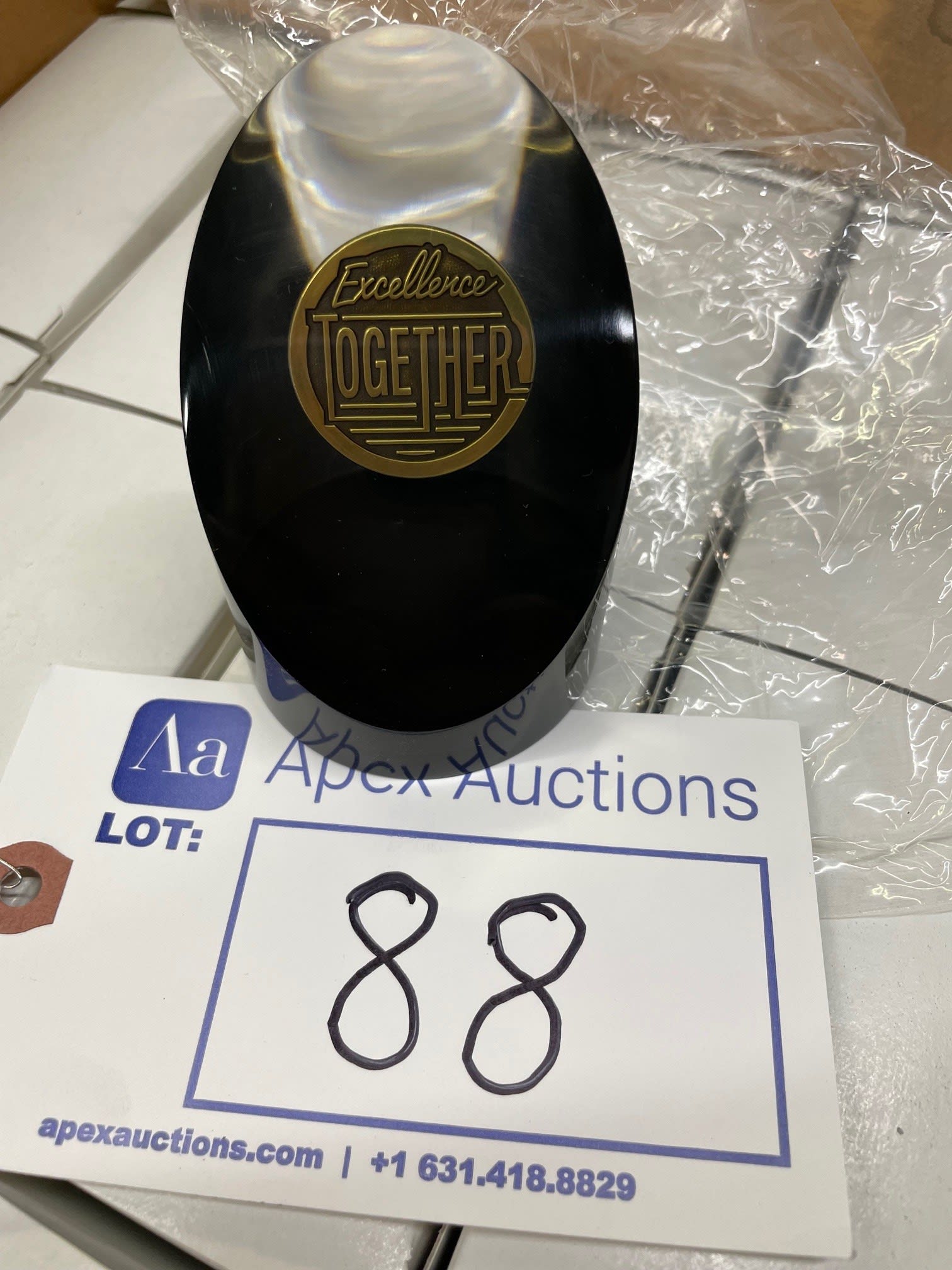 - Lot Appx (72) 3 3/8" x 2 1/2" Lucite Embedded Mini MedallionLot Appx (72) 3 3/8" x 2 1/2" Lucite Embedded Mini Medallion w/ 3/8" Black Lucite at Bottom