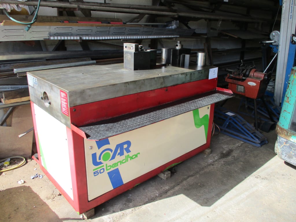 - 2011 Loar Bendhor-50 Horizontal Bending PressBending Pressure 50 Tonnes. Table Size Approx 800mm x 1,600mm. Stroke Length Approx 300mm. Power Supply 415 Volt, 5.5kW. S/No. 2.156.